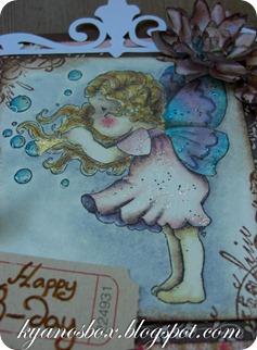 I love this fairy Tilda… she is adorable and I drool over longed haired Tildas (right, Alberto?!)!!! I painted her with distress pads, as usual, and I added some glitter on her skin, dress and wings for a more fairy look. I applied some gold leaf on the trumpet and some glossy on the bubbles. I used BasicGrey paper (Cappella and Green at Heart Collections) as background, a Making Memories ticket, some pearls, a lace and an old metal button. The white I-don’t-know-how-to-name-it something (maybe a frame?) on the top was cut with Slice Elite (Bravissimo Design Card).